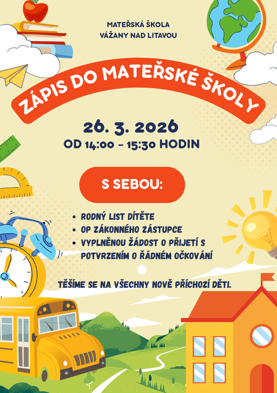 Termín zápisu: 26. 3. 2026, od 14:00 do 15:30 hod, v budově MŠ, třída Kuřátek